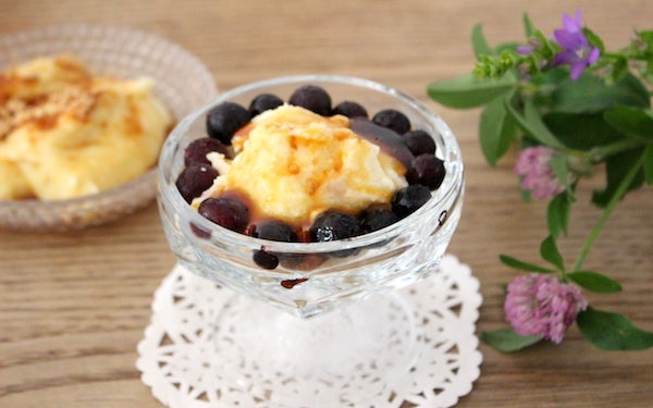 「豆腐のわらび餅風」をパフェグラスによそい、フルーツやジャムなどを加えれば、アイスを使わないパフェのでき上がり! ブルーベリーを飾りに見立ててトッピングすればかわいらしい仕上がりに。体を冷やしすぎない、ヘルシーなスイーツです。