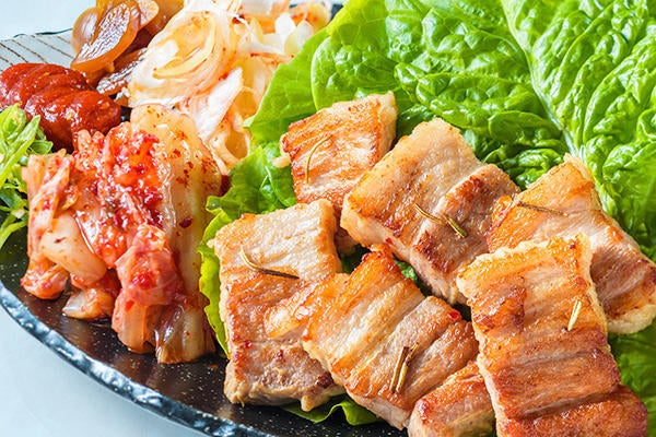 ▲『TEJI TOKYO』三元豚のサムギョプサル 700円(税込) / 柔らかい質感をつくるためワインに漬けた三元豚を使用。とてもジューシーで肉感たっぷり。野菜に巻いて、薬味と一緒に!【前半】