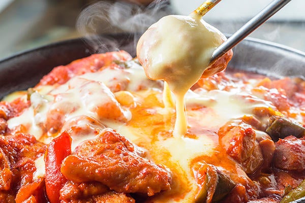 ▲『ハヌリ』チーズとろとろタッカルビ 700円(税込) / 鶏肉を特製ダレで一晩漬け込んだ旨辛チキンに、とろとろなチーズのコクが加わり、濃厚な味わいに!【前半】