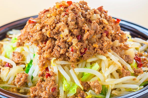 ▲『立川マシマシ』肉ぶっかけ野菜マシマシ 600円(税込) / 甘辛く炒めた挽き肉に柔らかく煮た背脂を合わせ、ガツンとパンチのきいたマシルーを大盛の野菜の上からたっぷりかけた一品。【前半】