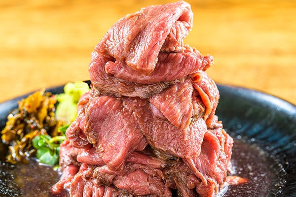 ▲『肉のヒマラヤ 焚火家』ローストビーフのヒマラヤ盛り 800円(税込) / そびえ立つヒマラヤ盛りを特製ニンニクバター醤油とわさびで召し上がれ!【前半】
