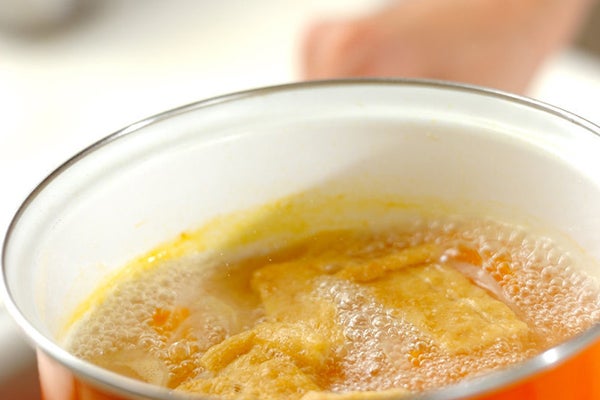 1、鍋にだし汁、玉ネギ、ニンジンを入れて中火にかけ、煮たったら油揚げを加えて玉ネギが透き通るまで煮る。