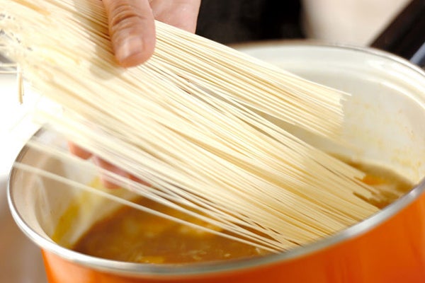 2、カレールウを溶き入れ、再び煮たったら素麺をそのまま加え、火を弱める。ひと煮たちしたら器に注ぐ。
