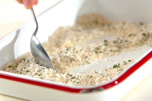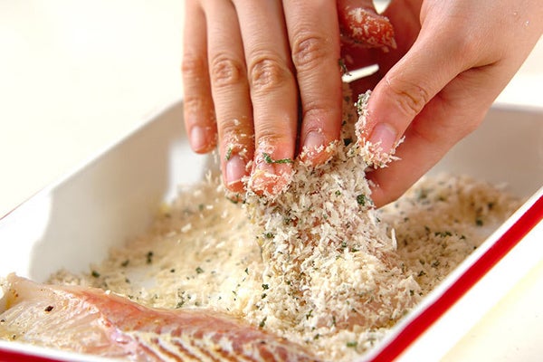 2、白身魚にオリーブ油をぬり、<ミントパン粉>をしっかりつける。