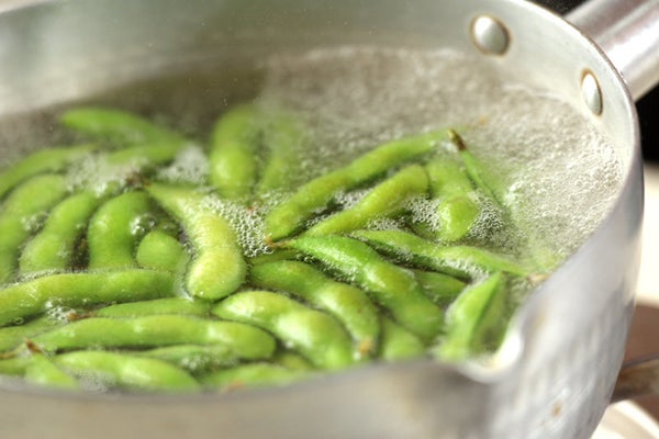・枝豆は水で洗ってボウルに入れ、塩をよくからめてたっぷりの熱湯に塩ごと入れ、煮たったら3~4分ゆでる(1粒食べてみて、お好みの固さになったらOKです)。サッと流水で洗って豆を取り出す。