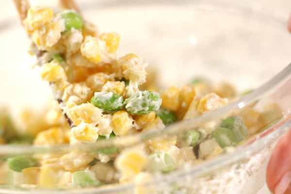 1、ボウルに枝豆とトウモロコシを混ぜ合わせ、水以外の<衣>の材料を入れて混ぜ合わせ、そこへ水を少しずつ加えながら、かろうじてまとまるくらいに混ぜ合わせる。