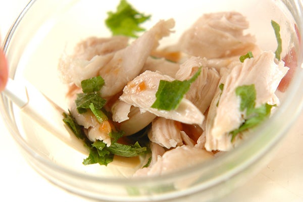 1、<梅肉ダレ>のボウルに鶏ささ身、大葉を加えて和え、器に盛る。