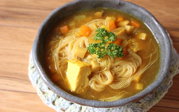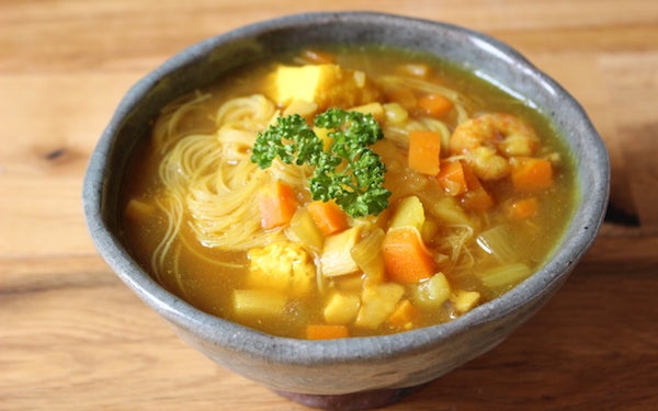 「辛くないカレースープ」の仕上がりにビーフンをそのまま加えれば、「カレー風味の汁ビーフン」のできあがり!ビーフンはゆでずにそのままスープに入れられるから、わざわざ別に麺をゆでたりご飯を炊いたりする手間がありません。ツルツルと食欲も進みますよ。