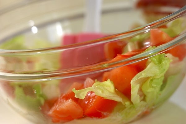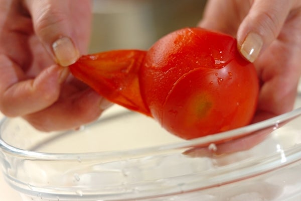 トマトは湯むきをし、ザク切りにする。レタスは、食べやすい大きさにちぎる。
