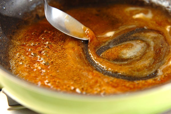 3、フライパンに<調味料>の材料を加え、ひと煮たちしたら(2)にかけ、サヤインゲンを添える。