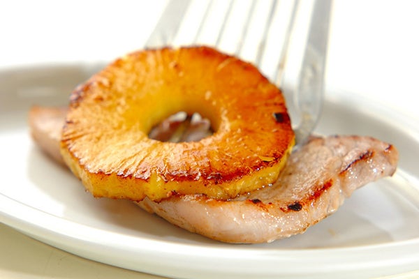 2、パイナップルは両面焼き色がつくまで焼き、(1)の豚肉にのせる。