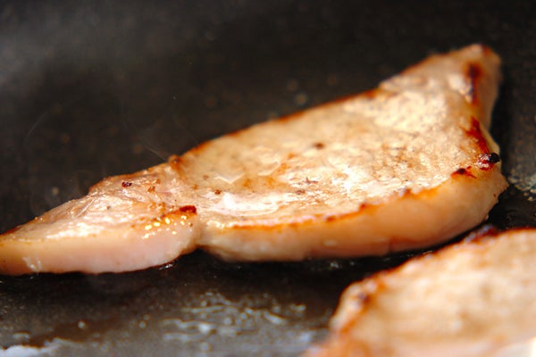 1、フライパンにサラダ油を中火で熱し、豚肉を盛り付けた時に上になる側から、おいしそうな焼き色がつくまで焼き、ひっくり返して裏面も同様に焼き、器に盛る。