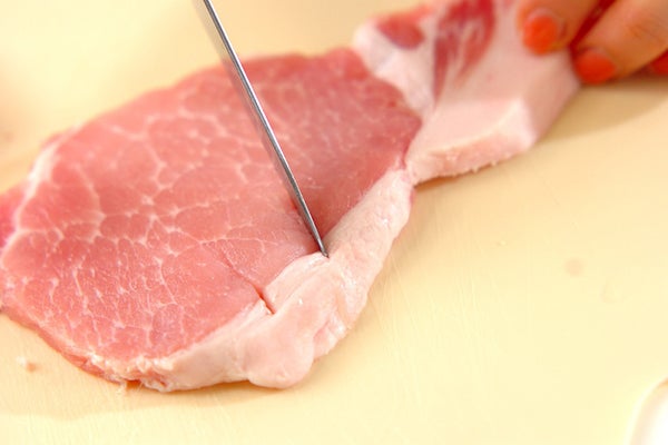 ・豚肉はすりこ木で軽くたたいてのばし、脂身と赤身の境目に4~5カ所切り込みを入れて筋を切り、両面に塩コショウを振る。
