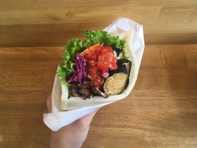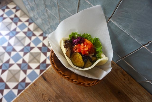 ですが、そんな心配はご無用!「いくらヘルシーでもおいしくなかったら意味がない」という点にこだわっているそうで、その意味はファラフェルサンドを食べれば納得すること間違いなし!薄いピタパンの中にぎっしりと具材が詰まっています。