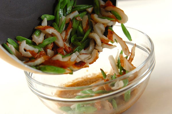 1、フライパンにサラダ油を中火で熱し、ちくわ、サヤインゲンを炒める。全体に炒められたら<ゴマダレ>のボウルに加えて和え、器に盛る。