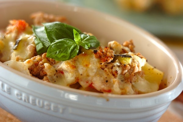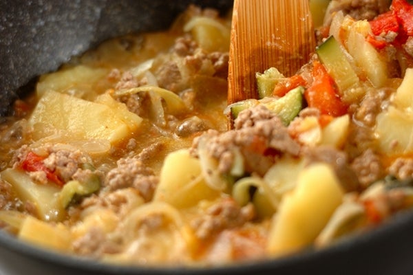 今回ご紹介する「ひき肉と夏野菜のグラタン」は、夏野菜をグツグツ煮込むことがポイント。野菜の旨みがたっぷり染み出たスープがあれば、ホワイトソースも牛乳だけで十分! バター不使用なので、ヘルシーなのも嬉しいですね。