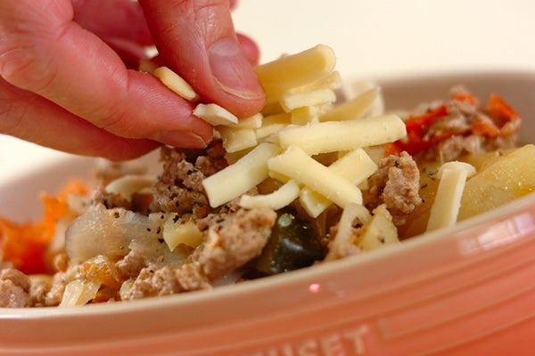 煮込んだ具材を耐熱容器に移してチーズをたっぷりかけたらトースターへ。 野菜が煮崩れてしまっても様になるので気軽にできますね。