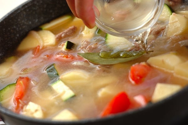 2、水気をきったジャガイモ、ズッキーニ、トマトを加えて炒め合わせ、全体に油がまわったら水をヒタヒタに注ぎ、<調味料>の材料を加える。