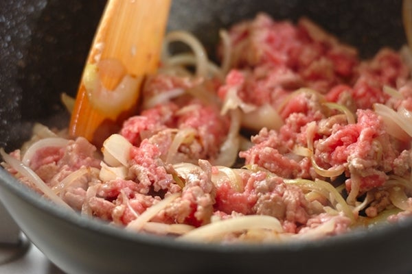1、フライパンにサラダ油と玉ネギを入れて中火で炒め、しんなりしたら豚ひき肉とニンニクを加えて炒め合わせる。