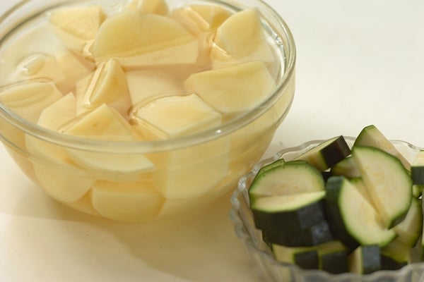 ・ジャガイモは皮をむいて小さめのひとくち大に切り、水に放つ。ズッキーニは幅7~8mmの半月切りにする。
