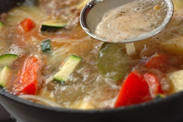 3、煮たったら弱火にしてアクを取り、フライパンに蓋をしてジャガイモが柔らかくなるまで蒸し煮にする。