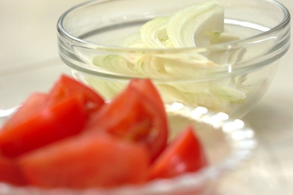 ・トマトはヘタをくり抜き、8つのくし切りにする。玉ネギは縦薄切りにする。
