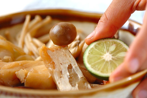 3、キノコがしんなりしたら、しょうゆを加えてひと煮立ちさせ、火を止める。器に盛り、スダチを添える。