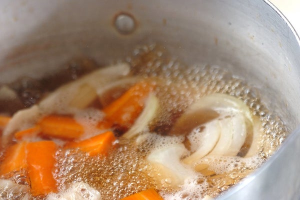 1、鍋にだし汁、<調味料>を入れて煮立ったら、玉ネギ、ニンジンを加える。煮立ったら火を少し弱めて3~4分煮る。