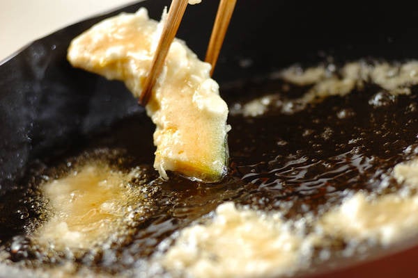 2、カボチャは<衣>をサッと通し、160℃の揚げ油でゆっくりと揚げる。揚げ色がついたら取り出して油をきる。