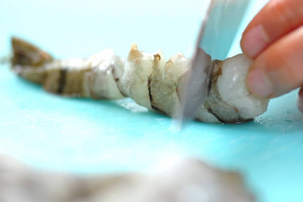 ・エビは尾を残して殻をむき、尾の先は切り落として水気をしごき出しておく。背ワタを取り、腹側に斜めに切り込みを入れ、まな板の上で背側から押さえ付け、まっすぐにのばす。