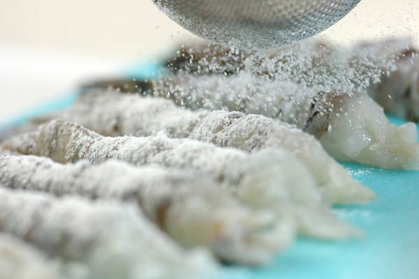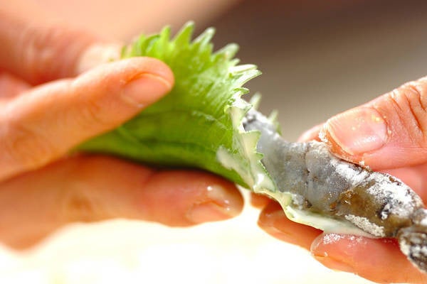 1、エビ、大葉、マイタケ、カボチャに薄く分量外の小麦粉をからめる。