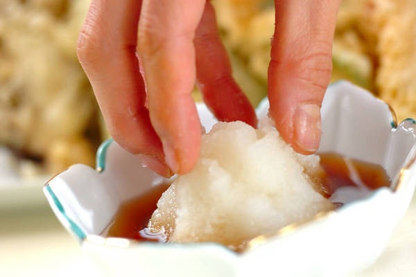 4、器に盛り合わせ、麺つゆ、大根おろしを添える。