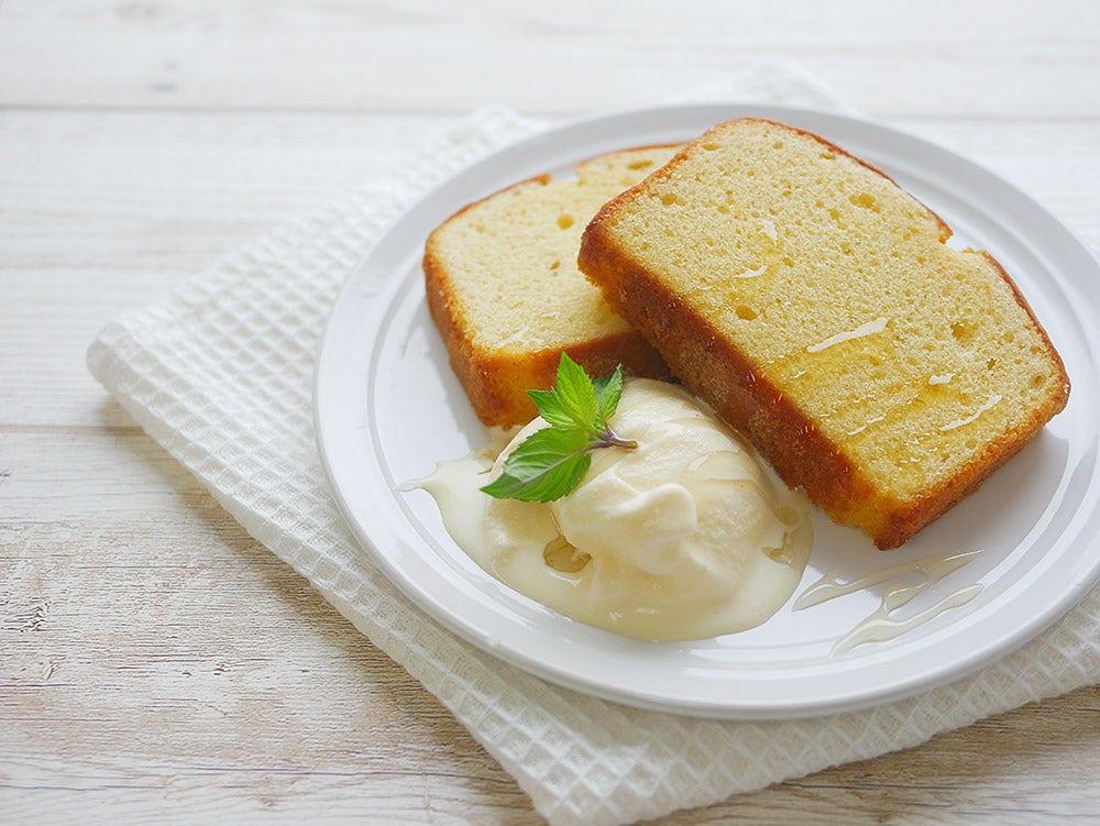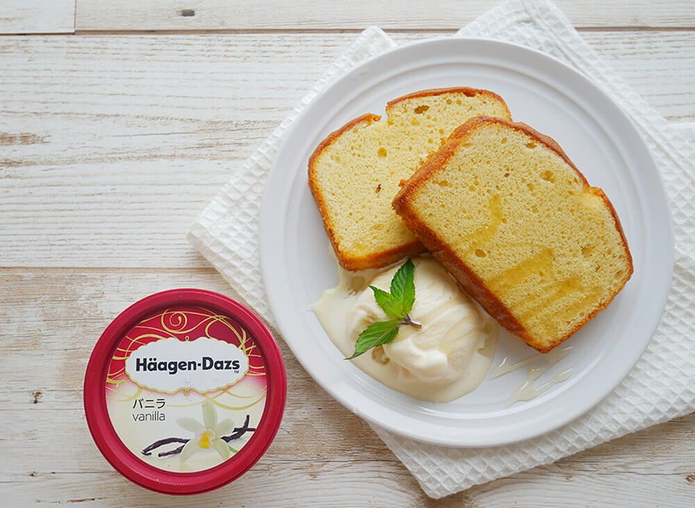 おしゃれカフェのメニューにありそうなこちらも、市販のパウンドケーキにバニラフレーバーをそえただけ。パウンドケーキの濃厚な甘さと、アイスのさっぱりとした甘さが混ざり合い、よりしっとりとした食感に。ボリューミーだけど、不思議とペロリと食べることができちゃうんです♡アイスの量を調節して、ふわふわ〜しっとりまで色々な食感を楽しんでみてくださいね。