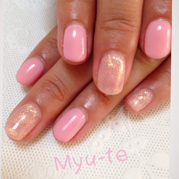 青い光が輝く淡いピンク。透明感と輝きをプラス。