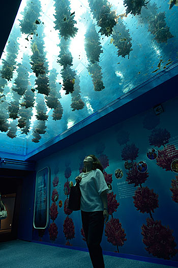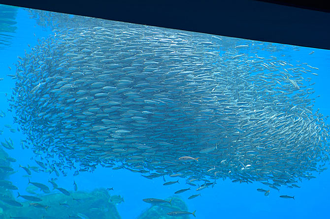 天井から自然光が降り注ぐ幅13ⅿ、高さ6.5ⅿもの巨大な水槽に、マイワシの群れなどがのびのびと泳いでいて、いつまでも見ていたくなる美しさに惚れ惚れ…♡