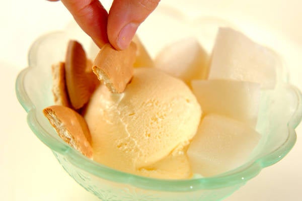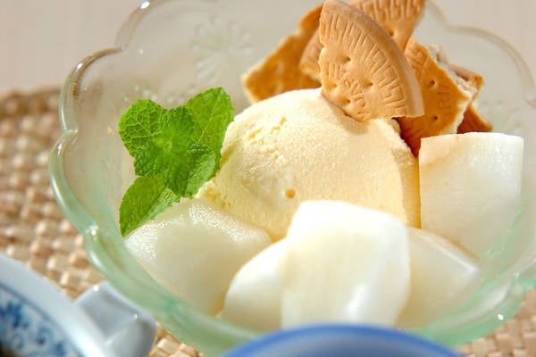 梨の魅力を引き出す、新しい食べ方を試してみませんか? 作り方は、カットした梨に市販のビスケットとバニラアイスを加えるだけで完成です。