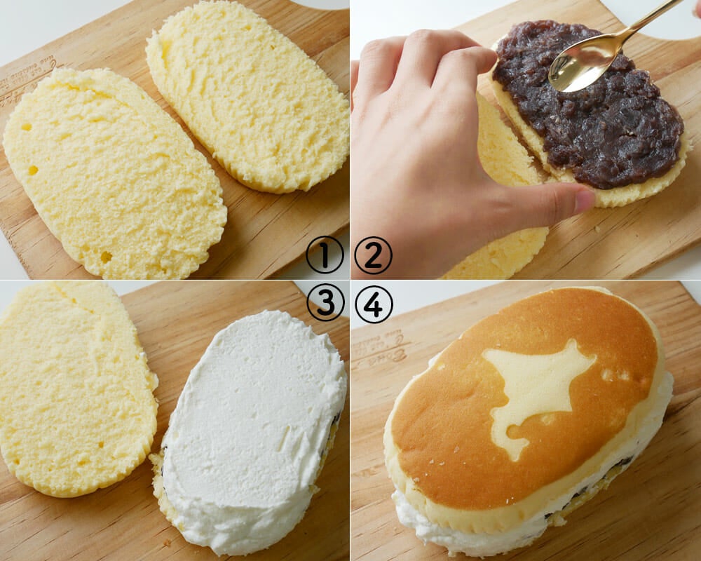 ②下部分の蒸しケーキに、つぶあんを薄く塗っていく