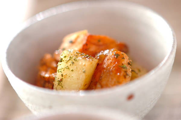 ジャガイモをレンジで加熱している間に鮭の下ごしらえをしておけば、あとは混ぜるだけ。ドライパセリのグリーンがサーモンピンクに映えて彩り豊かな一品に仕上がりますよ。