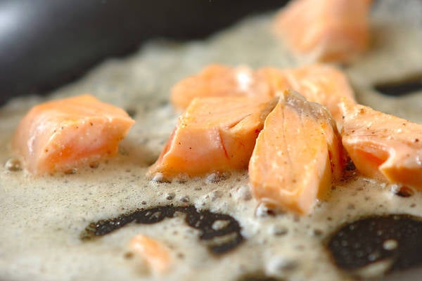 2、鮭は皮を取ってひとくち大に切り、フライパンにバターを入れて中火にかけ、鮭をしっかり炒めて少し強めに塩コショウで味を調える。
