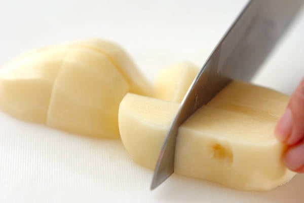 1、ジャガイモは皮をむいてひとくち大に切り、水に通して耐熱容器に並べ、ラップをかけて電子レンジで3~4分加熱する。竹串がスッと刺さったらOKです。