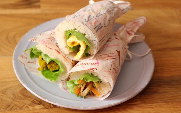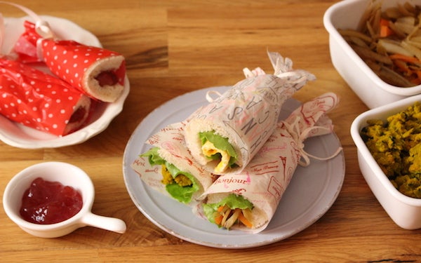 残りおかずで手軽にキュートな軽食が食べられる「常備菜 de サンドラズ」。定番のハムやチーズのほか、ウインナーや豚のしょうが焼きなどを入れてもいいですね。赤や黄色の彩りおかずを入れると華やかになりますが、茶色いおかずならラッピングペーパーをかわいい色にするのがオススメ。