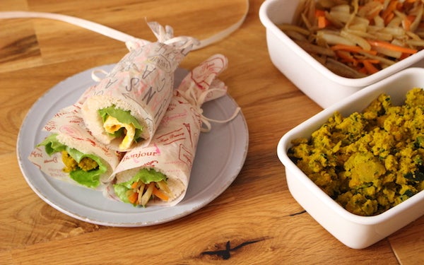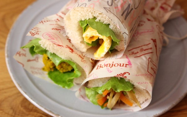 2、サンドウイッチ用パンの上にレタスを敷き、3枚のパンにそれぞれきんぴら、かぼちゃのサラダ、薄焼き卵を入れて花束のように巻く。