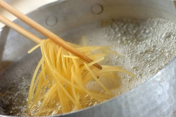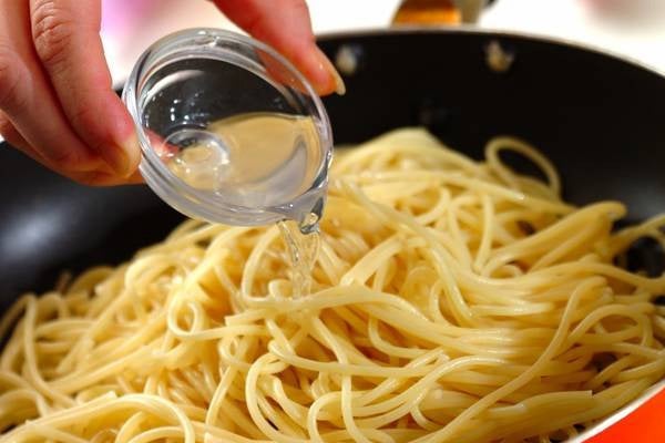 ・塩15gを入れたたっぷりの熱湯にスパゲティーを入れ、指定時間より少し短めにゆで、ザルに上げる。ゆで汁は大さじ1残しておく。