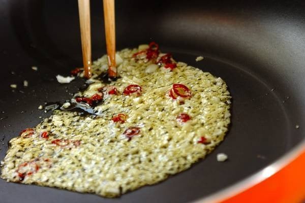 1、フライパンにオリーブ油、ニンニク、赤唐辛子を入れて香りがするまで弱火にかける。