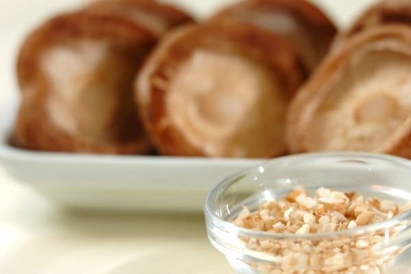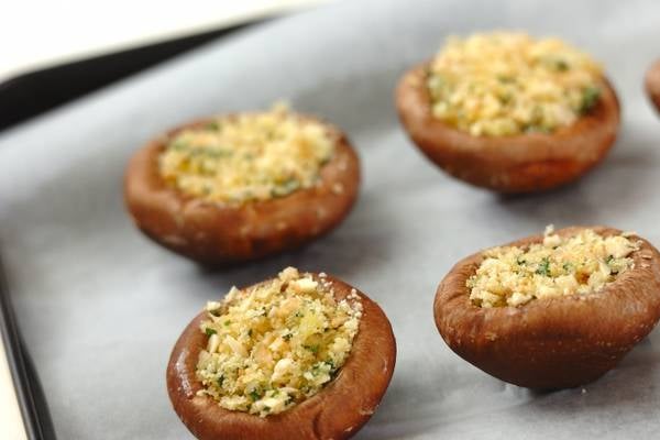 パン粉にチーズ、ニンニクやドライパセリなどを混ぜ、シイタケに詰めてオーブントースターで焼いた「パン粉焼き」。こうばしい香りが食欲をそそります。石づきをみじん切りにしてパン粉に混ぜるため、丸ごとシイタケを食せるエコなメニューです。