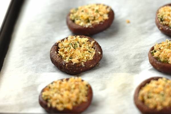 2、オーブントースターの天板にオーブンシートをしき、シイタケの軸側を上にして並べる。上に(1)をのせる。