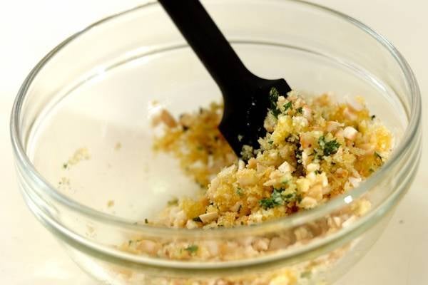 1、ボウルに<香りパン粉>の材料とみじん切りにした軸を入れ、混ぜ合わせる。