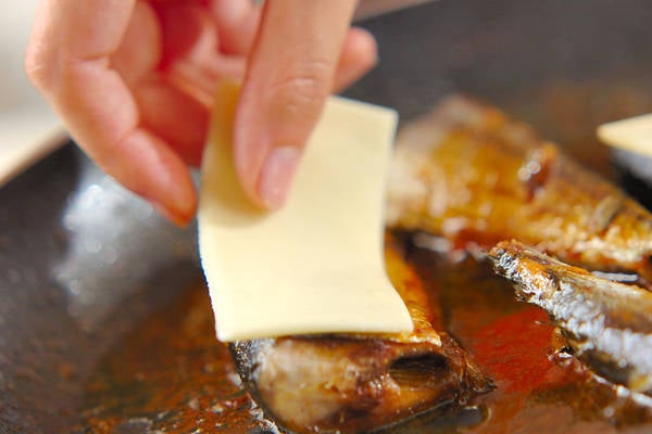 3、<合わせダレ>を加え、中火にしてタレがからまったら火を止める。サンマにスライスチーズをのせ、再び蓋をして余熱でチーズを溶かす。サンマを器に盛ってドライパセリを振り、水洗いしたプチトマトを添える。