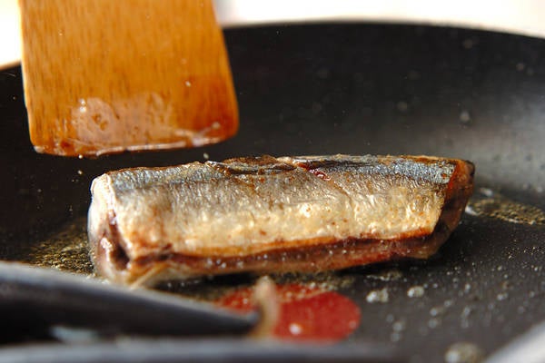 2、フライパンにサラダ油を入れて中火にかけ、フライパンが熱くなったら、サンマを並べる。フライパンに蓋をして少し火を弱め、2分蒸し焼きにしてサンマをひっくり返し、再びフライパンに蓋をして2~3分蒸し焼きにする。
