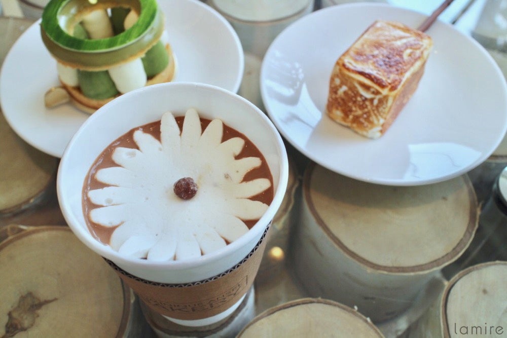 まるでお花が咲いたように開くのです。上にのっているお花の正体は薄く伸ばしたマシュマロ。ホットチョコレートはビターな味わいになっていて、マシュマロが溶けてきたころに、ちょうど良い甘さになるように計算されているそうです♪
